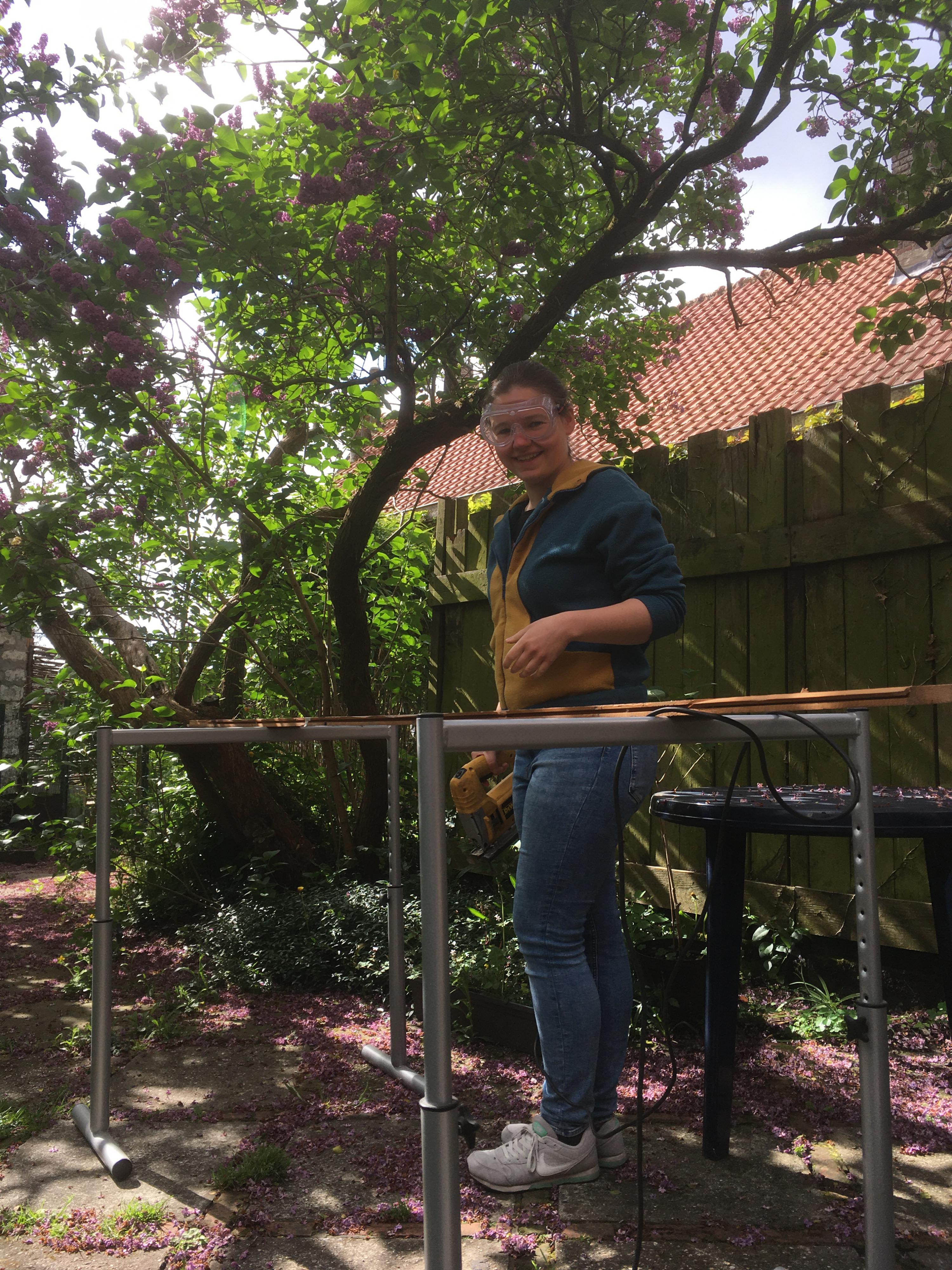 Om te zorgen dat de brokstukken niet te diep zouden vallen bevestigden we een plastic zeil dat afhelde richting de kamer op't 2de verdiep zodat we daar alles konden verzamelen. Zo kon ik van bovenaf de houten latjes doorstampen met de voeten. Enige nadeel: de houten latjes waren genageld, dus Emma moest constant gaten in het zeil dichtplakken.