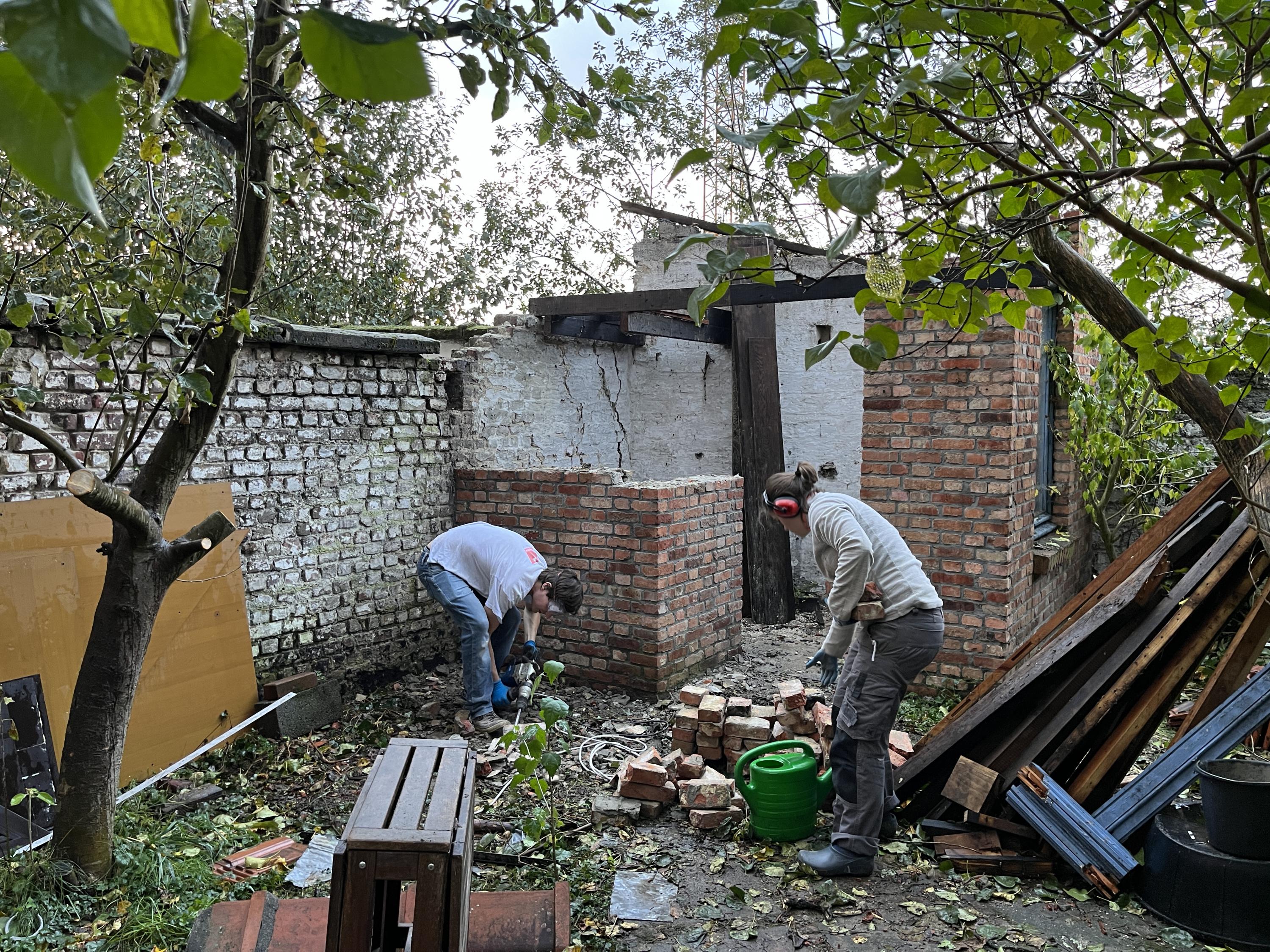 De laatste stukjes muur werden afgebroken door de aannemer. Dat betekende ook weer tijd om "steentjes te kuisen": dumpster diving naar recupsteentjes, en dan de mortelresten afkappen. Weer wat extra materiaal om de nieuwe fietsenberging later op te bouwen!