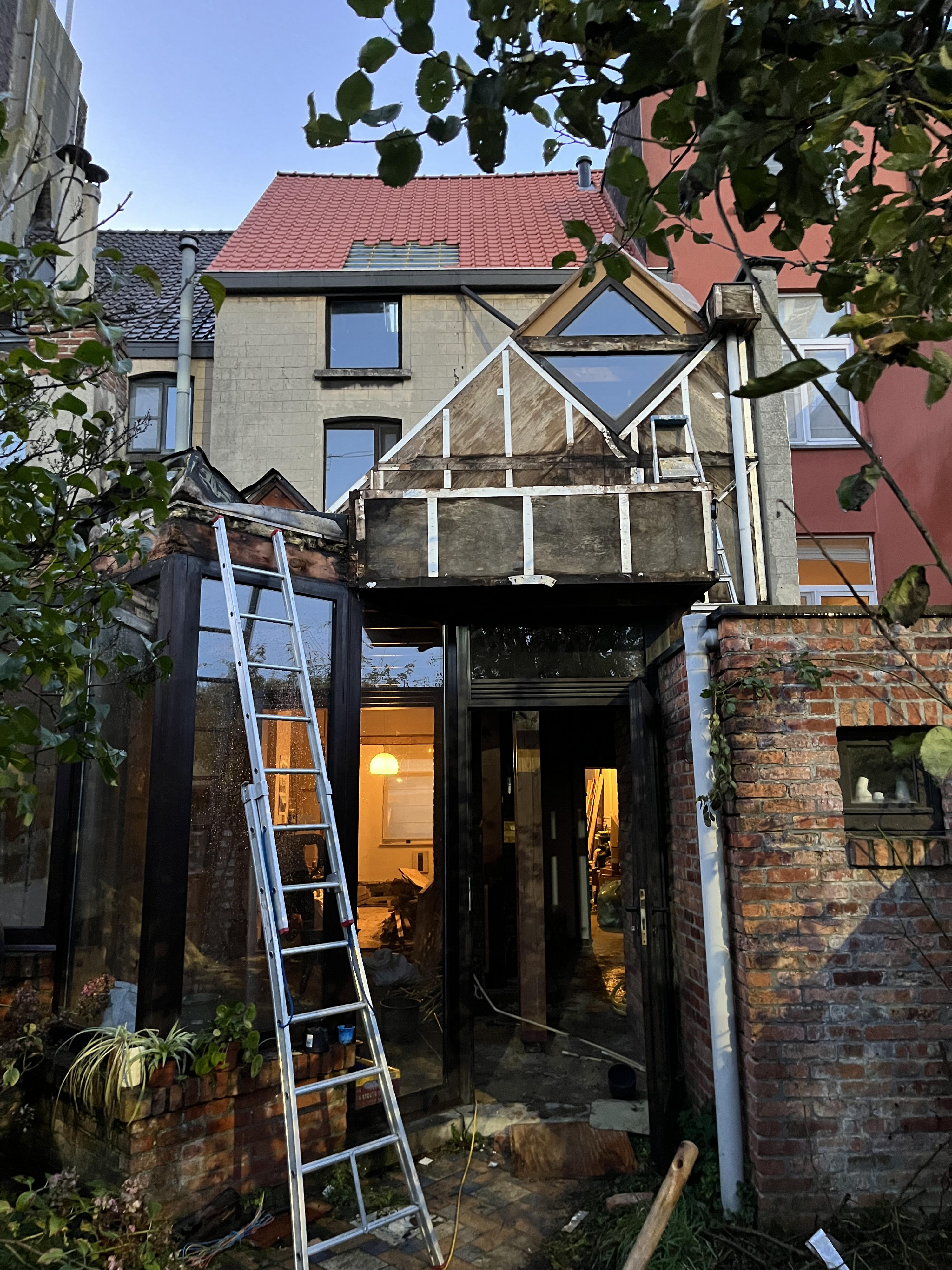 Er wordt zorgvuldig afgebroken zodat we de balken van de achterbouw zouden kunnen hergebruiken in de nieuwe fietsenberging.