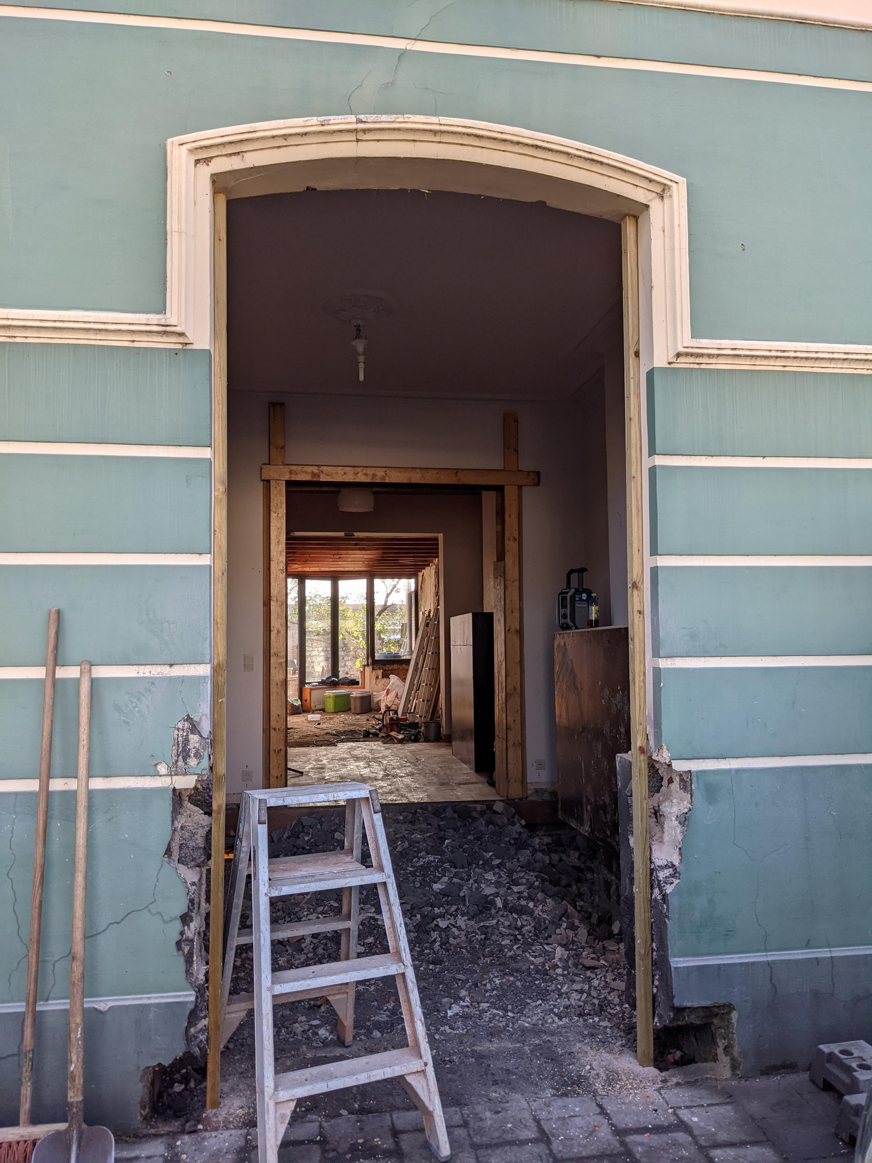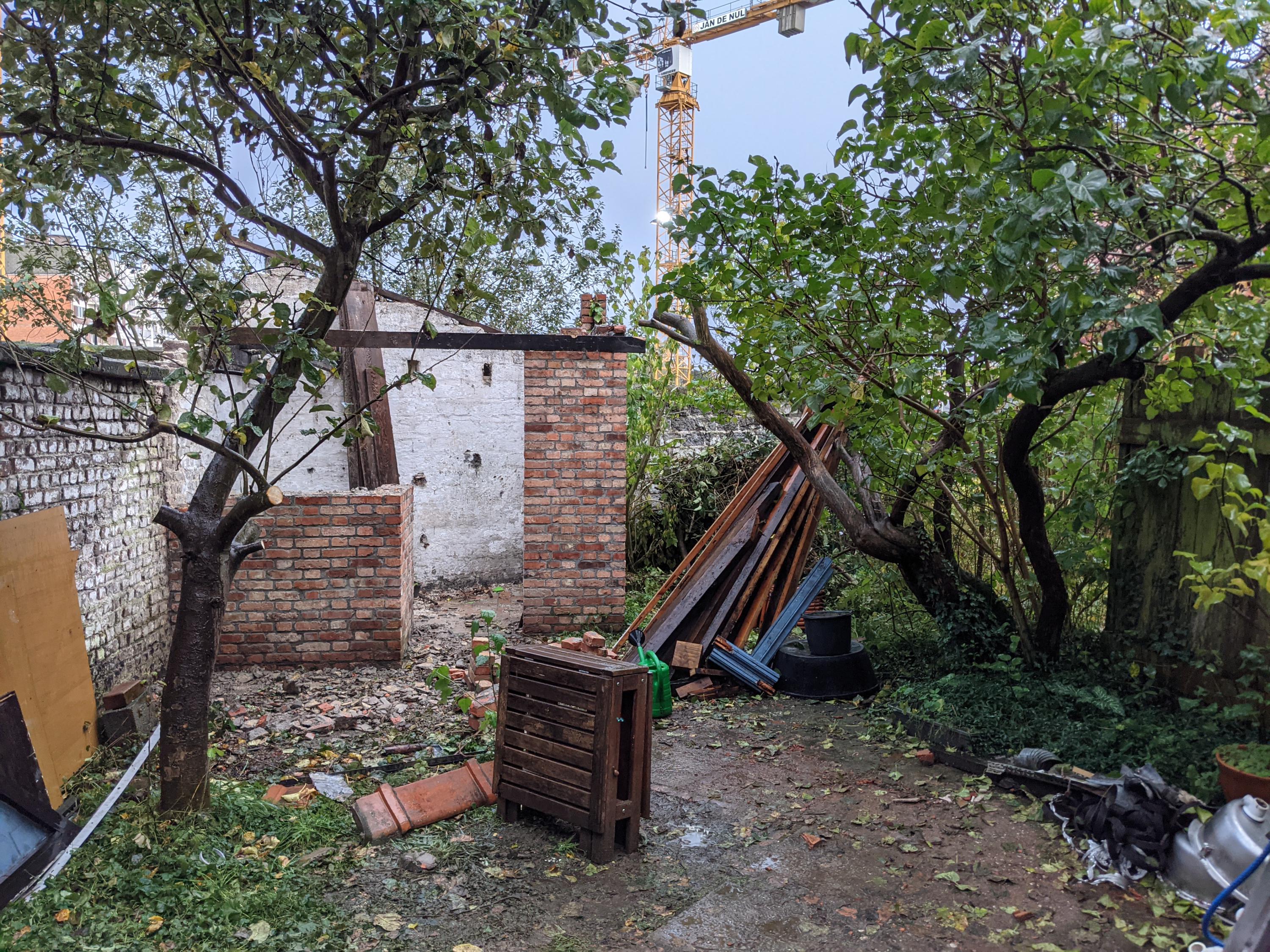De aannemer heeft vandaag de achtermuur voorzichtig afgebroken en een helling gemaakt om van achter uit toegang te hebben tot ons terrein.
