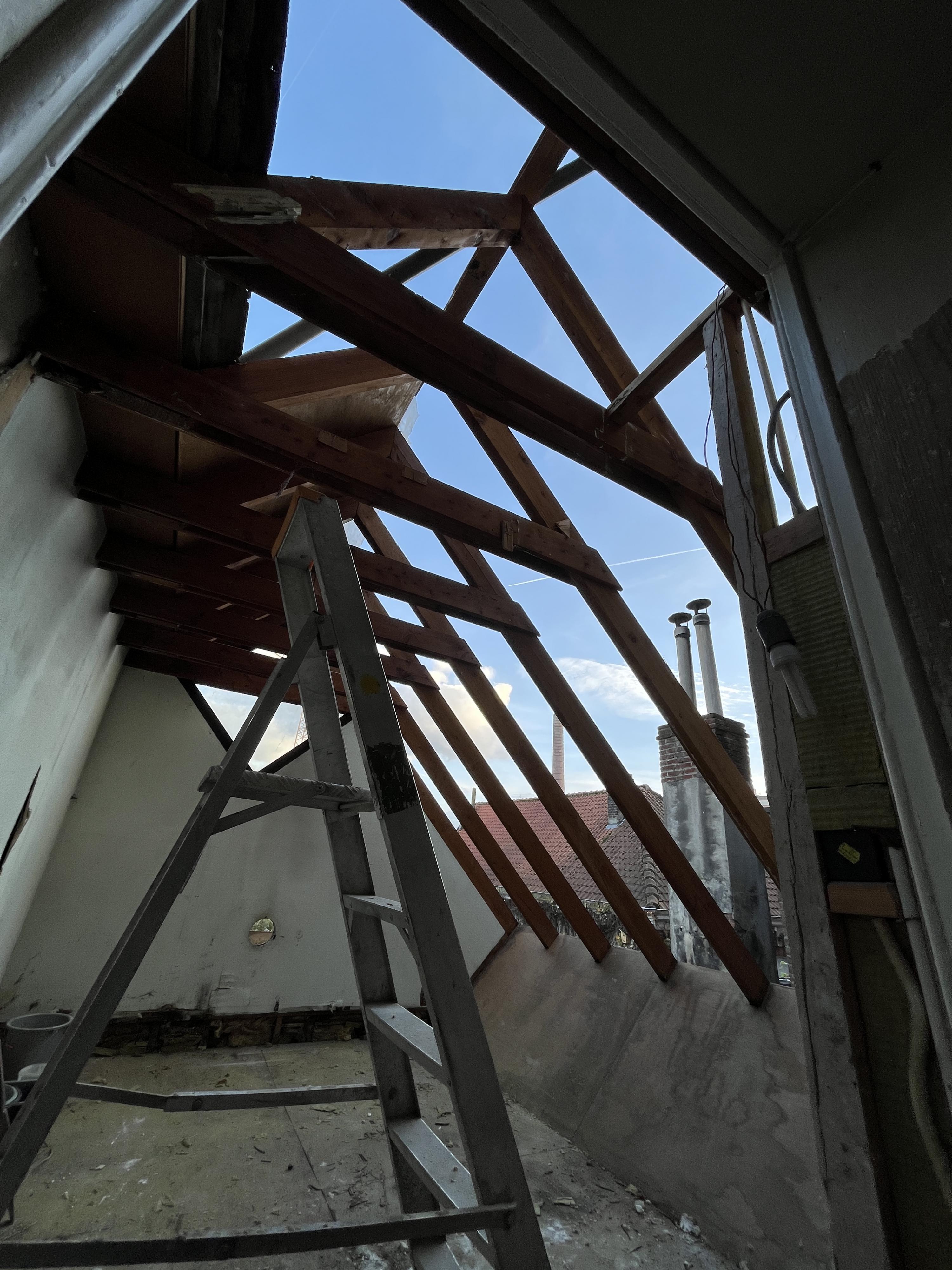 De rest van de schouw bleek heel erg los te staan, wat extra problematisch was aangezien de gemene muur aan de andere kant daartegen geschoord was. Met wat puzzelwerk hebben we dat redelijk kunnen oplossen, maar ik ga toch blij zijn als er weer een achterbouw staat zodat alles weer opgeblokt staat.