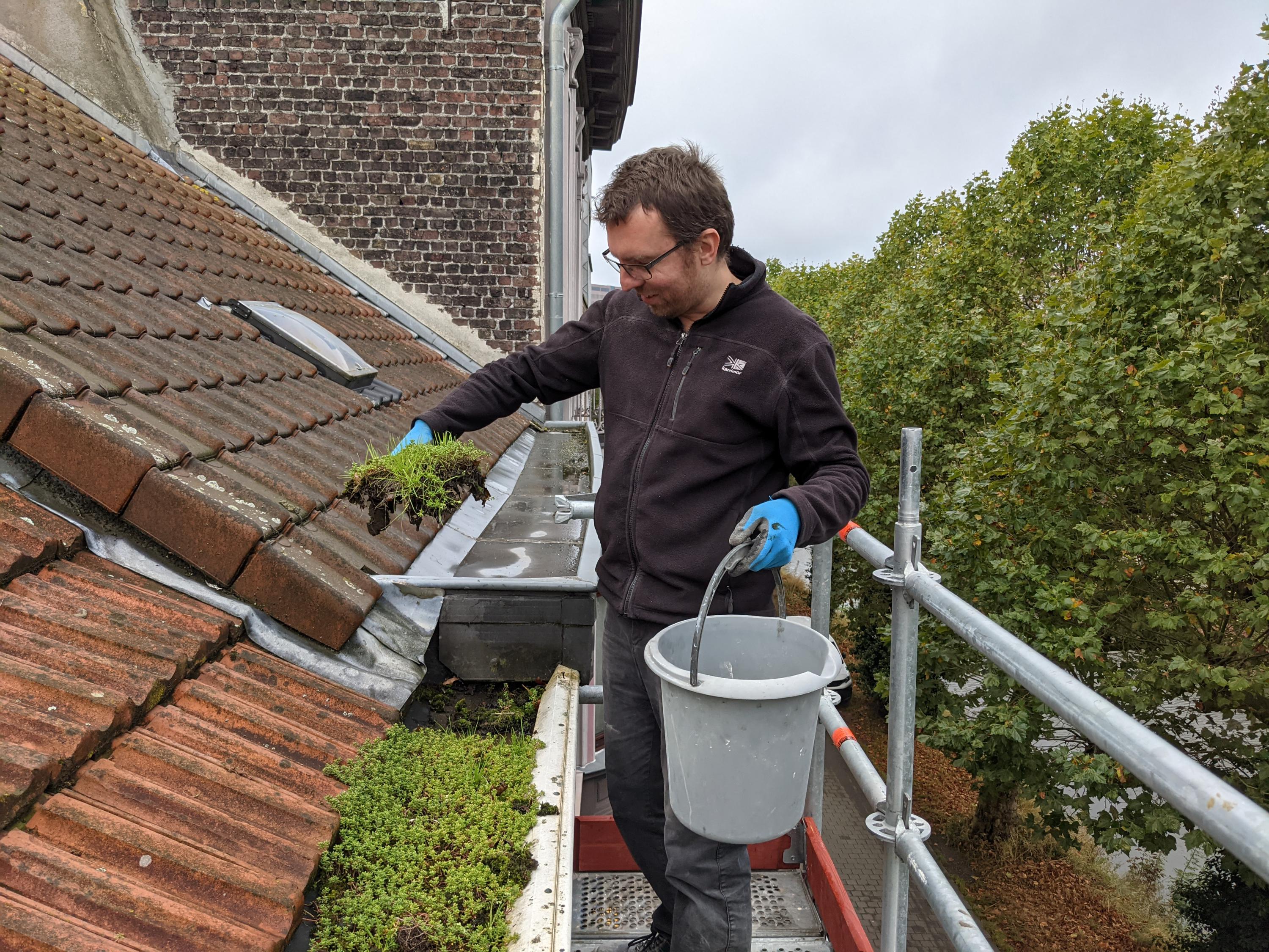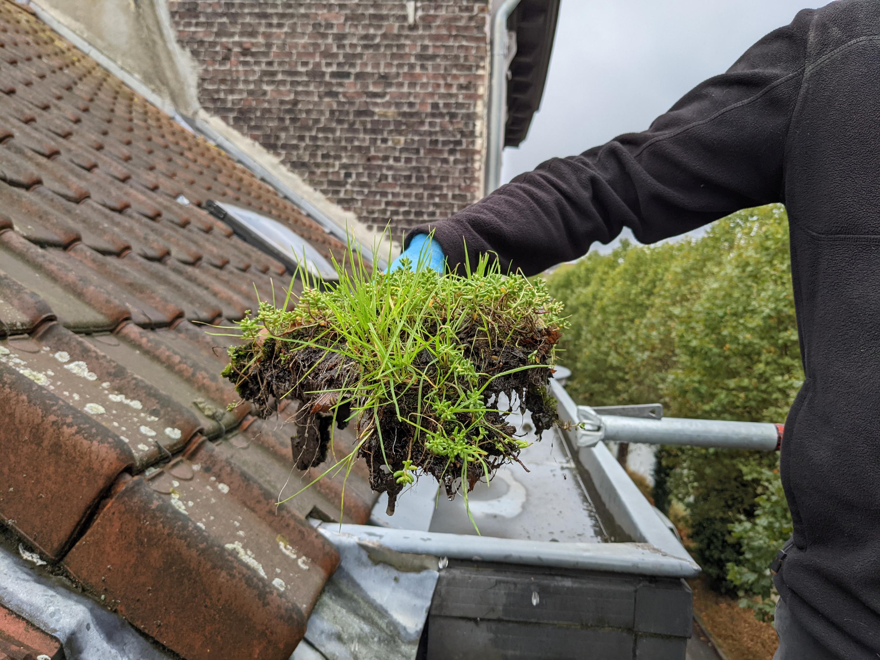 Nu de stelling er staat kunnen we eindelijk gemakkelijk aan de dakgoot vooraan. Dat was duidelijk al even geleden, want er had zich een heus groendak gevormd, inclusief sedumplantjes. Gelukkig hadden we nog nooit problemen gehad met de afwatering. Het "groendak" deed dus z'n werk 😅