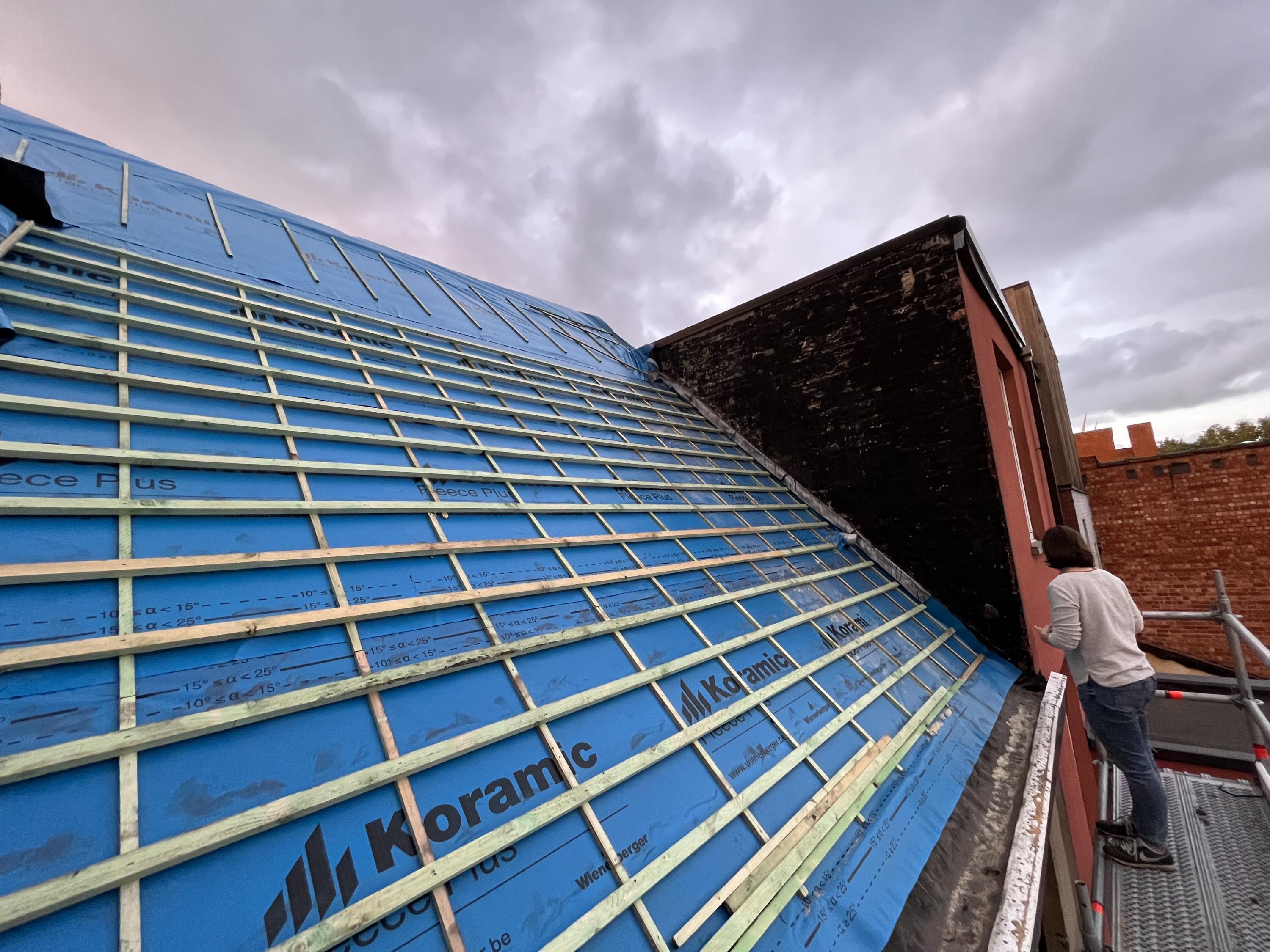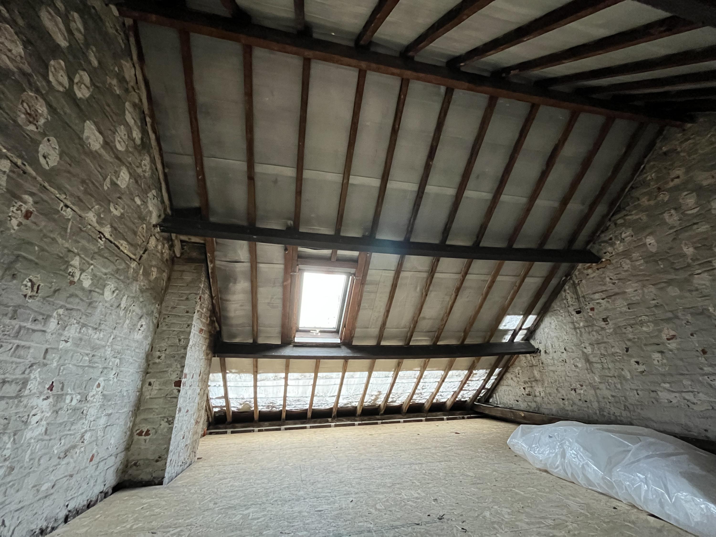 Het nieuwe dakraam vooraan werd geplaatst (dat van achteraan is jammer genoeg nog in bestelling en wordt in een latere fase geplaatst) en op belangrijke plaatsen werd de zijgevel beschermd tegen insijpelend vocht.