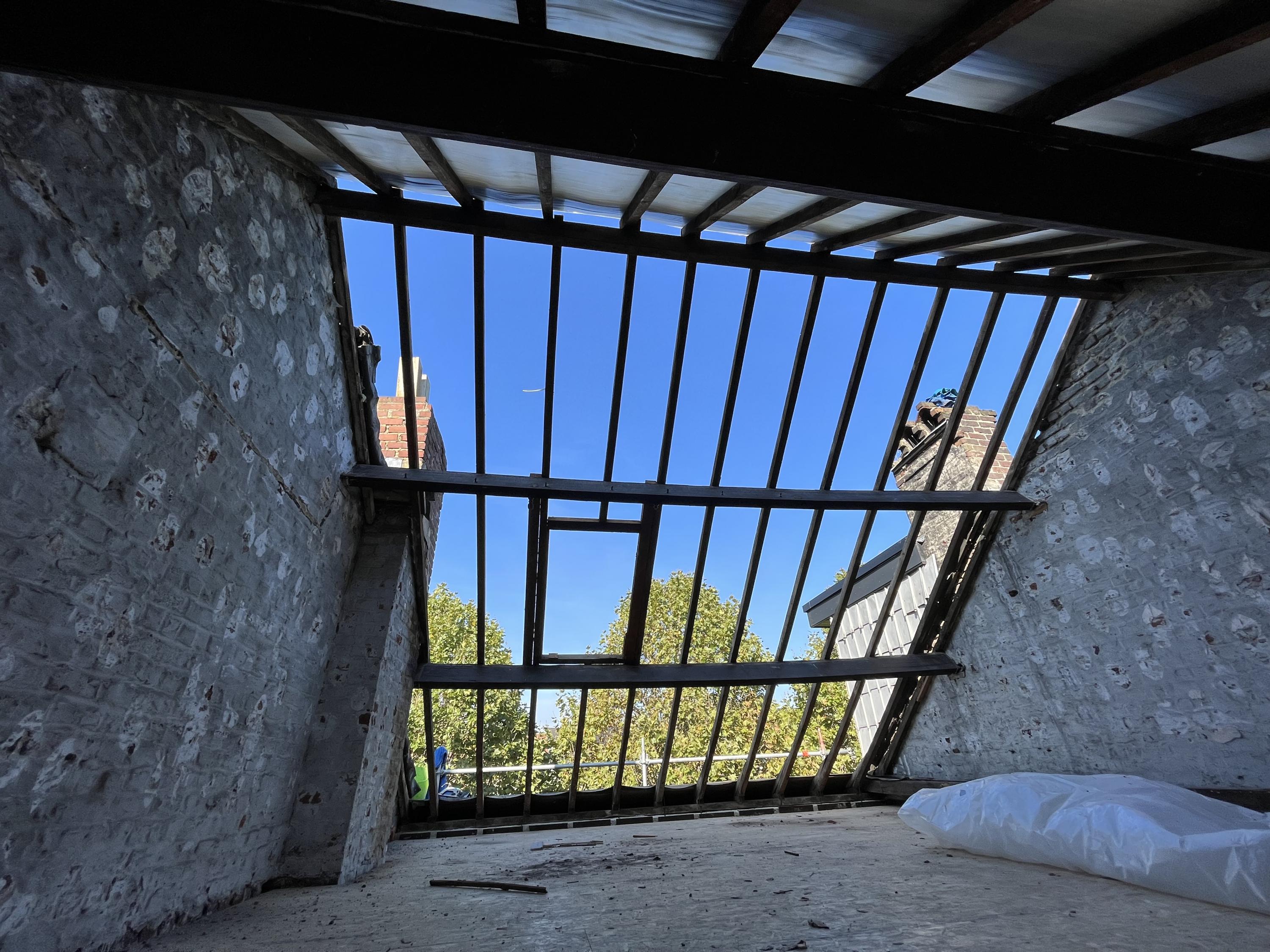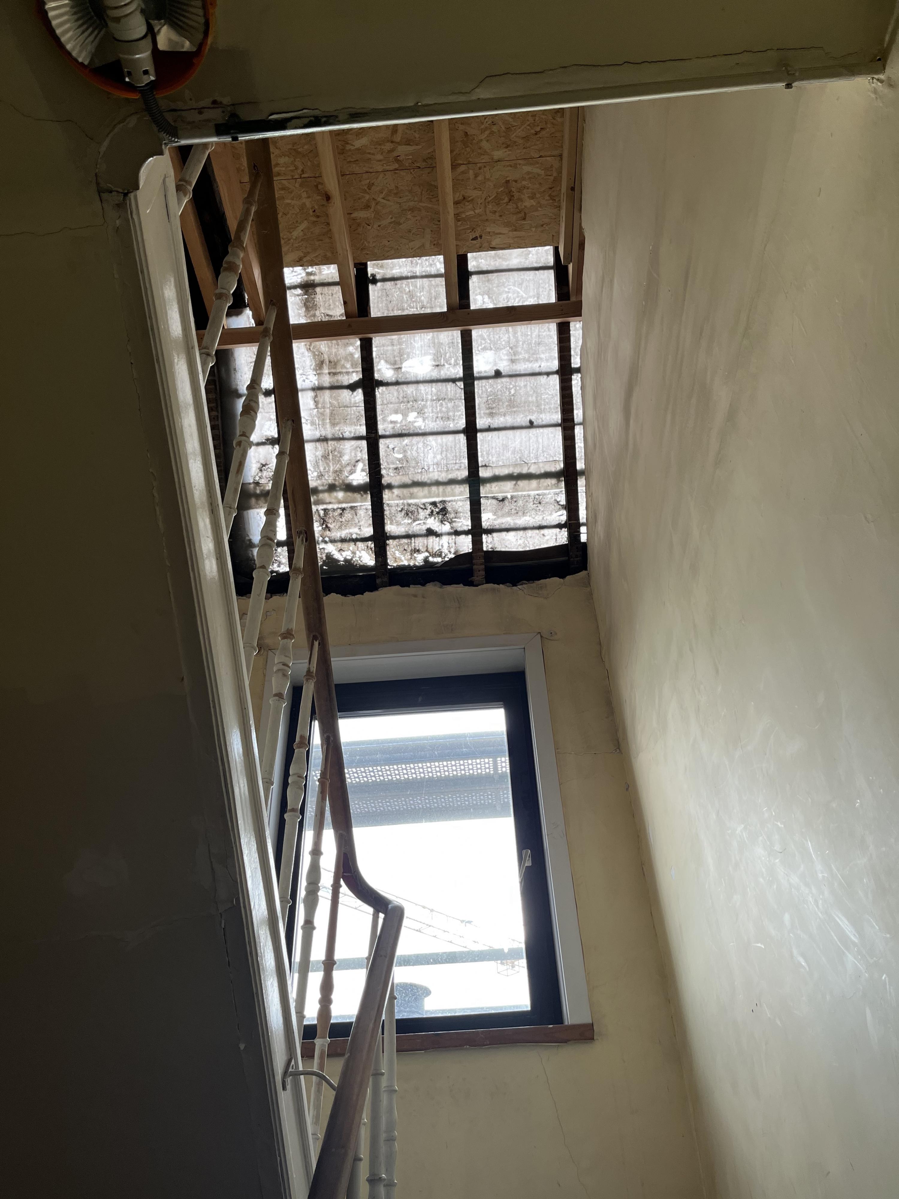 De schouw vooraan wordt afgebroken tot op de zoldervloer. Daaronder wordt ze gebruikt om ventilatiebuizen door te trekken.