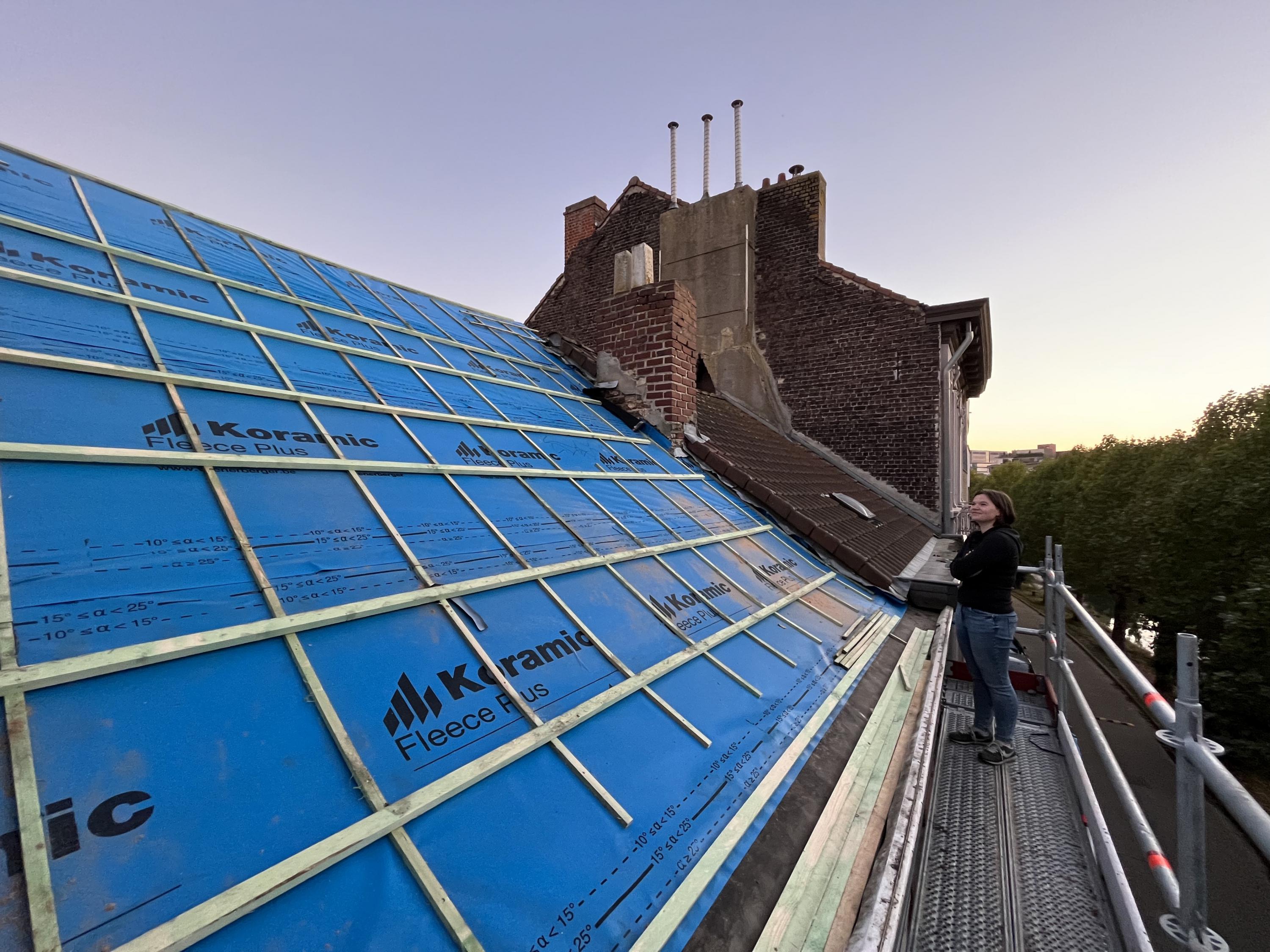 De dakpannen van het achterste dakvlak werden afgenomen en bijgehouden om te hergebruiken op het voorste dakvlak (dat is kleiner, dus mag er er wat verlies zijn).