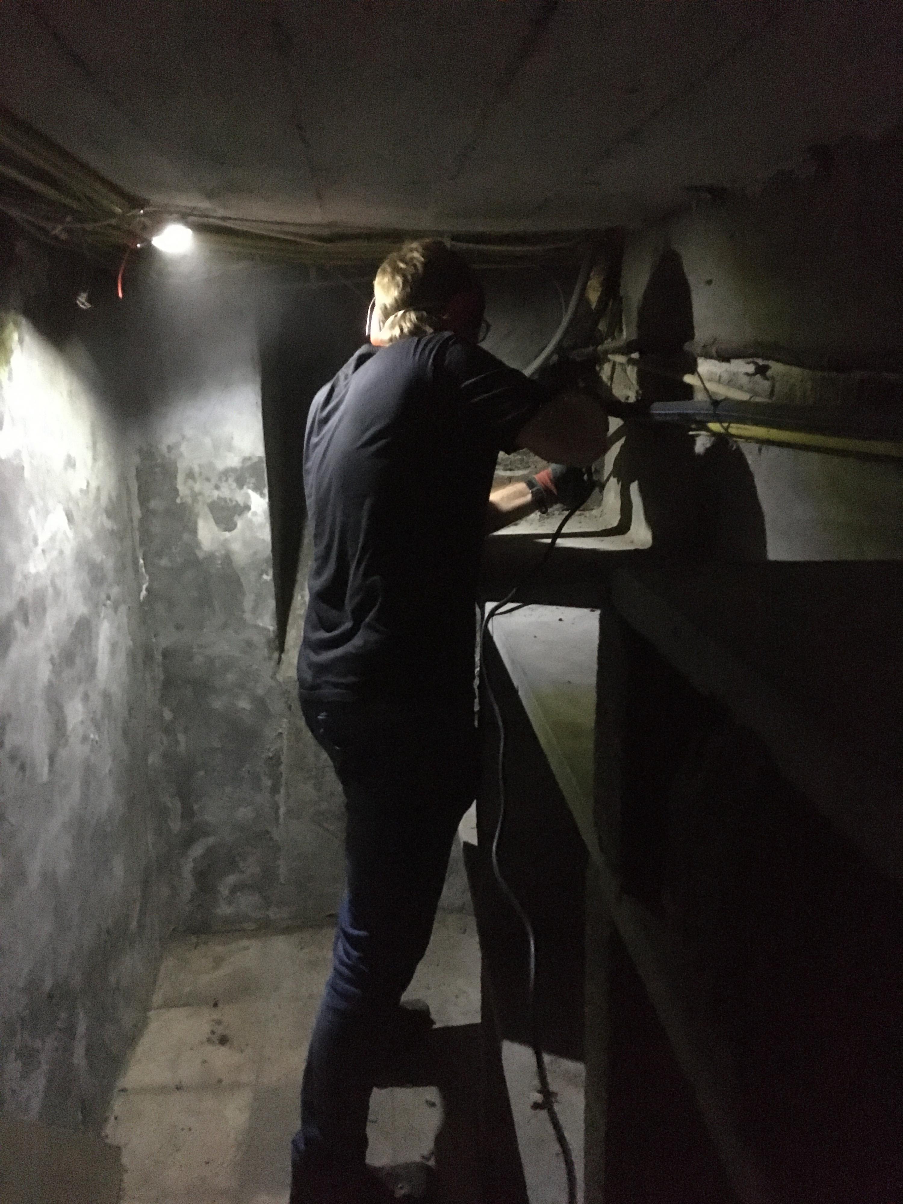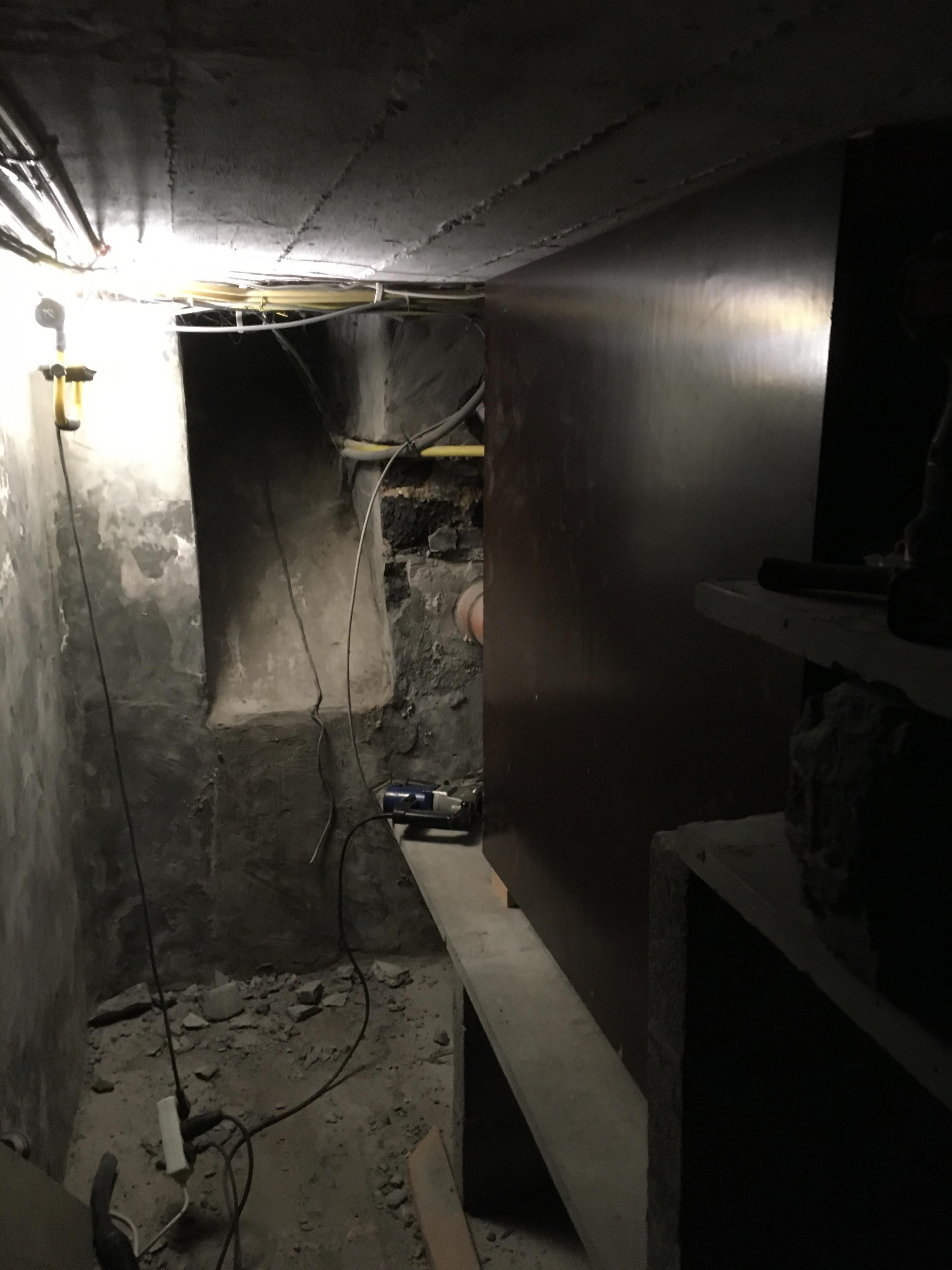 In de keldergang die tot de voorgevel loopt stonden echter betonnen rekken waardoor de beschikbare ruimte te smal werd volgens de regels van Fluvius.