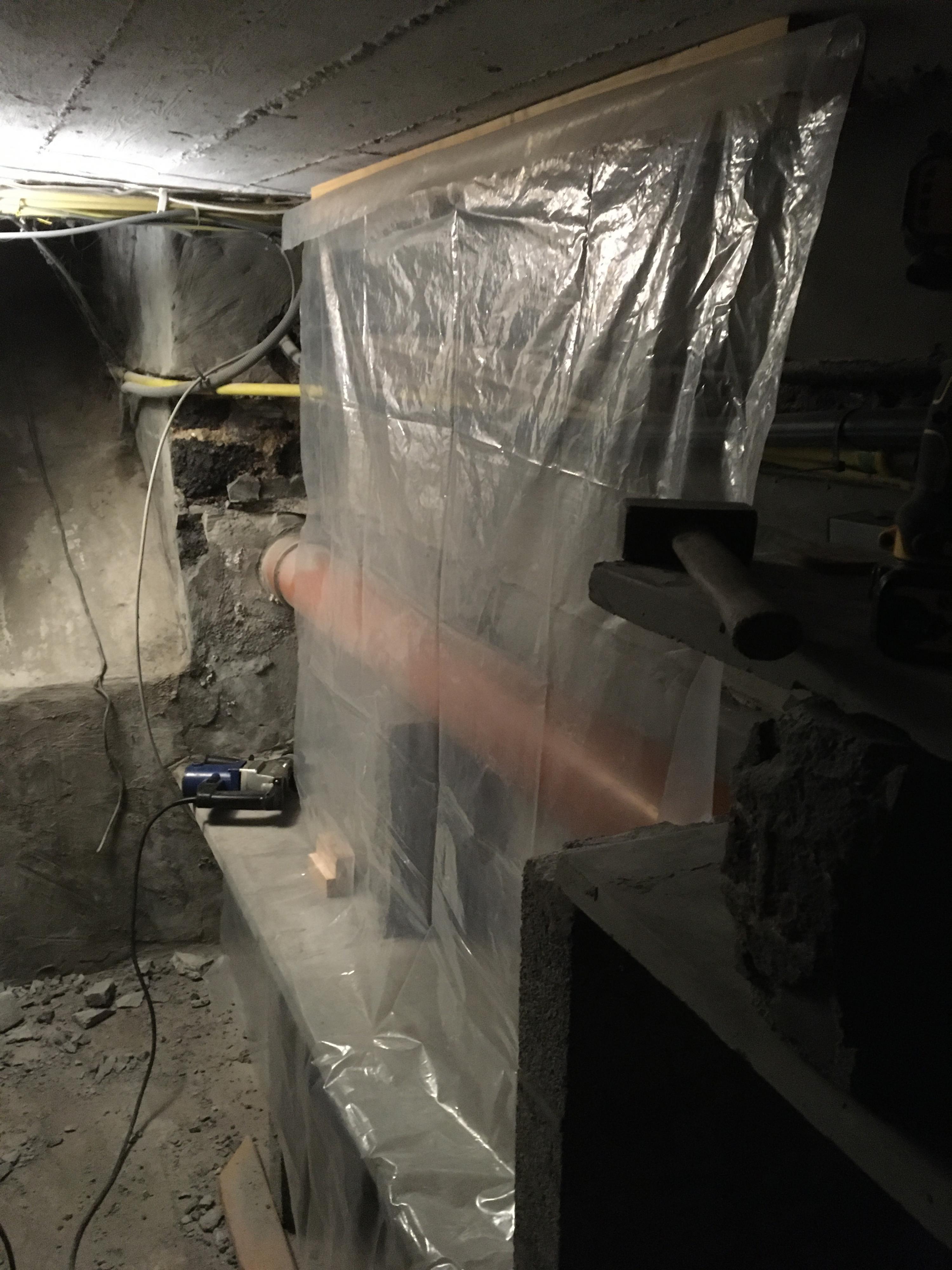 Voor de zekerheid raadde m'n vader ons aan om een plasticfolie tussen de plaat en de water- en rioleringsleidingen te voorzien. Mocht er ooit een lek zijn kan alles mooi onder de plaat wegvloeien dan.
