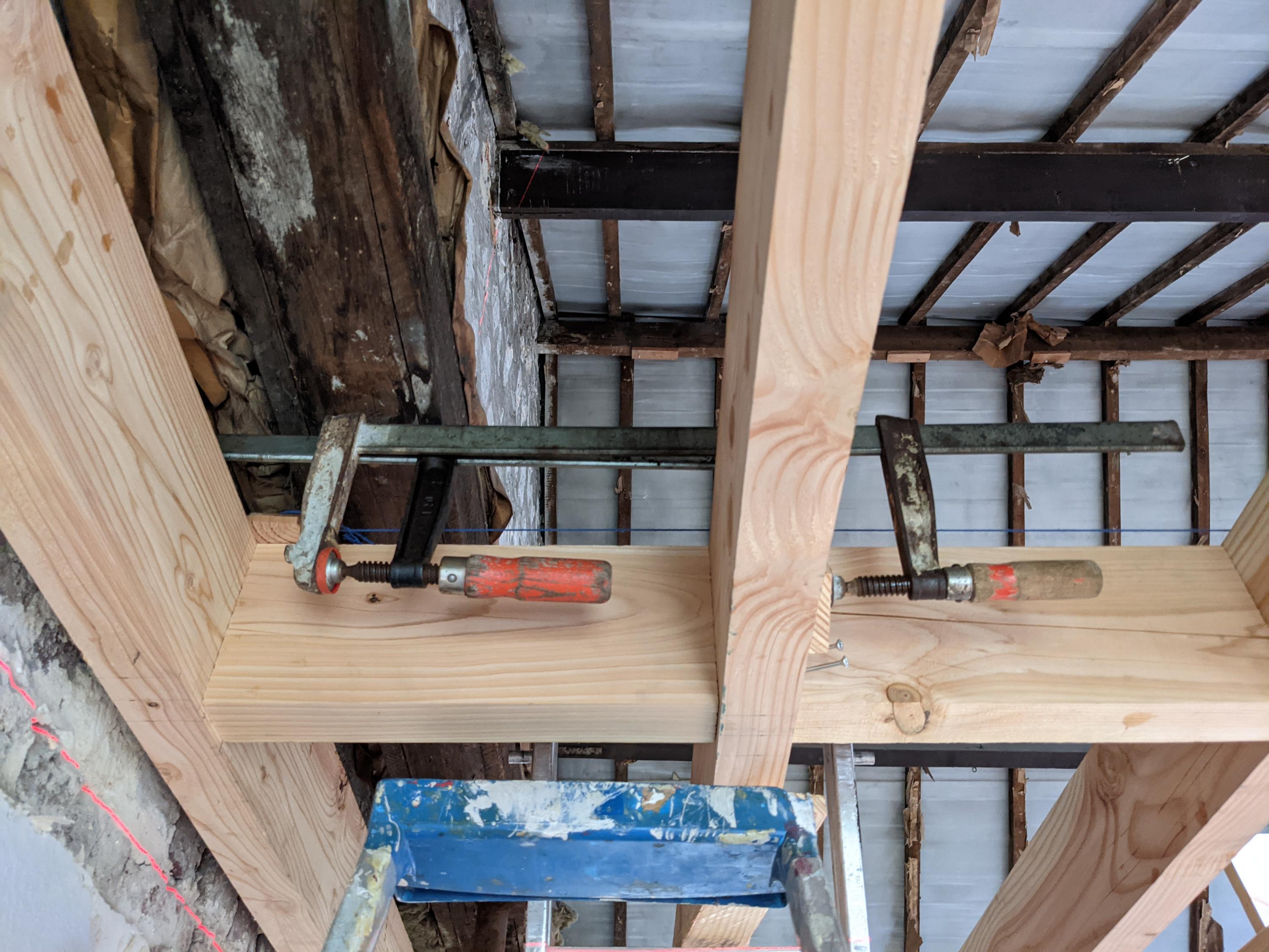 Al tijdens het leggen van de balken bleek dat het hout nog erg jong was en er nog vaak hars uitdrupte. Bij het uitdrogen trokken ze zo scheef dat we weken hebben nodig gehad om ze op te blokken aan de voorgevel, middenmuur en aan de vide.